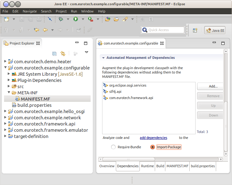 Switch back to the Manifest Editor. Under Automated Management of Dependencies, ensure the Import-Package option button is selected. Click the add dependencies link to automatically add packages to the dependencies list (under Imported Packages) based on the “import” statements in your example code. Save changes to the Manifest again.