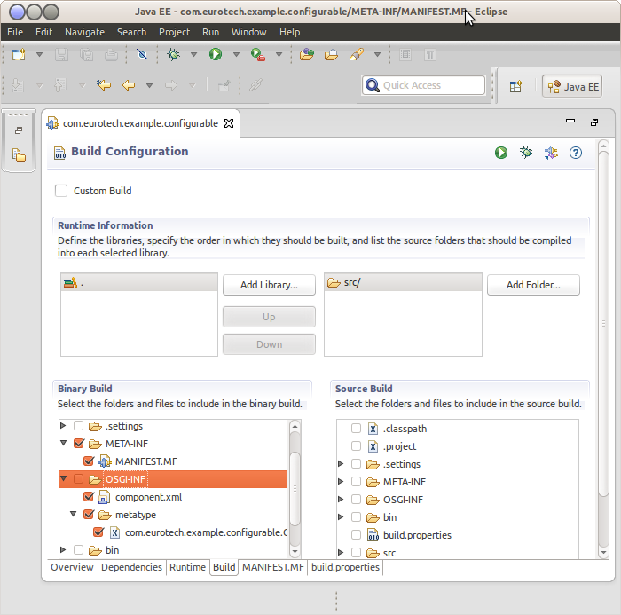 Now in the MANIFEST.MF of this bundle, you must also make sure the XML file gets packaged into the bundle when you export the plug-in. Click the Build tab, and in the Binary Build section of the Manifest editor ensure that all the checkboxes for items under META-INF and OSGI-INF are checked. Save the Manifest after making this change.